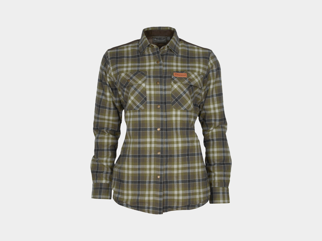 Pinewood Douglas kvennmannsskyrta úr mjúku flannel með vindheldri og vatnsfráhrindandi himnu. Gervi rúskinni á öxlum og olnbogum. Með smellum.
